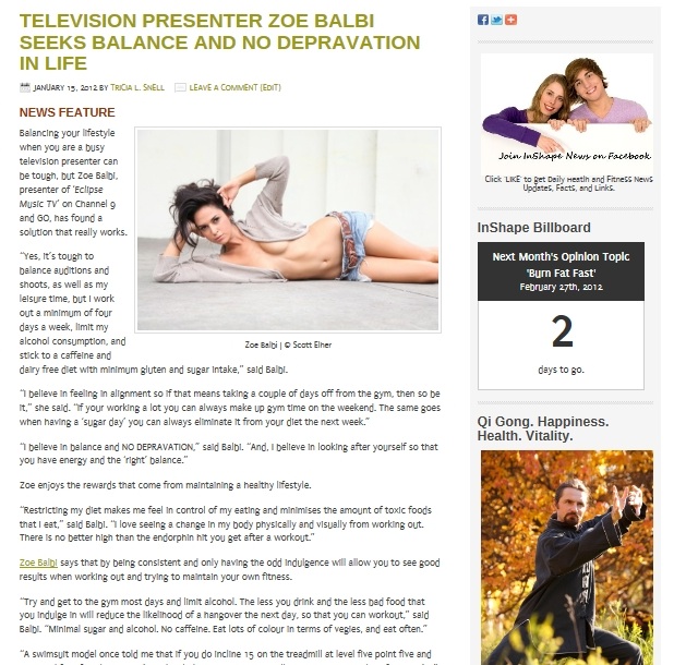 Reference – InShape NewsFlash (2012) Entertainment News Feature: Television Presenter Zoe Balbi Seeks Balance and No Depravation in Life, InShape NewsFlash December 2012, Australia.