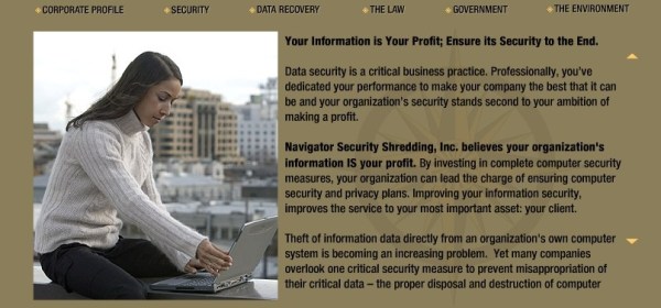 Webpage content | Navigator Security Shredding – New York, U.S.A: “Thanks for being so attentive to details. This is the single most outstanding quality that shows me that Tricia really cares. It will be a pleasure to continue working with her.”